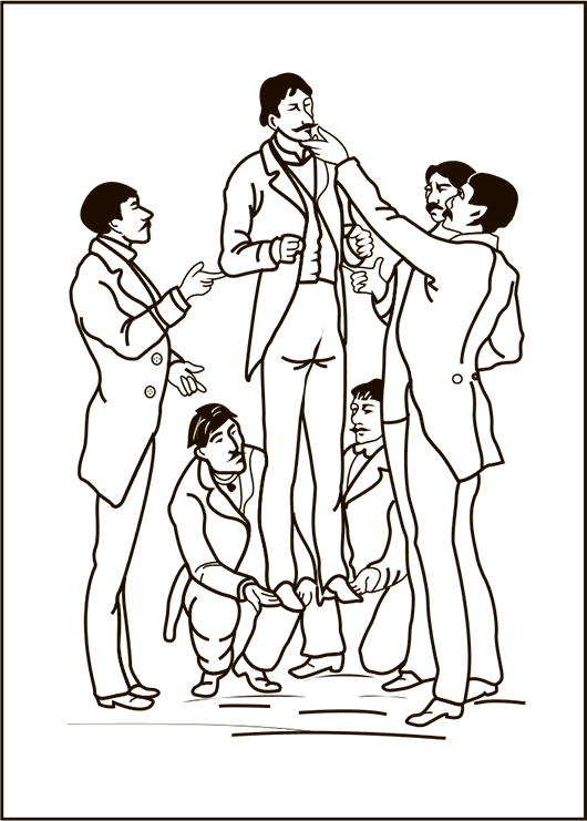 Кто никогда не пробовал делать этого опыта, тот наверное скажет, что поднять взрослого человека на пальцах – невозможно. Между тем это исполняется очень легко и просто. В опыте должно участвовать пять человек: двое подсовывают свои указательные пальцы (обеих рук) под ступни поднимаемого; двое других подпирают указательными пальцами правой руки его локти; наконец, пятый подкладывает свой указательный палец под подбородок поднимаемого. Затем, по команде: – Раз, два, три! – все пятеро дружно поднимают своего товарища, без заметного напряжения.