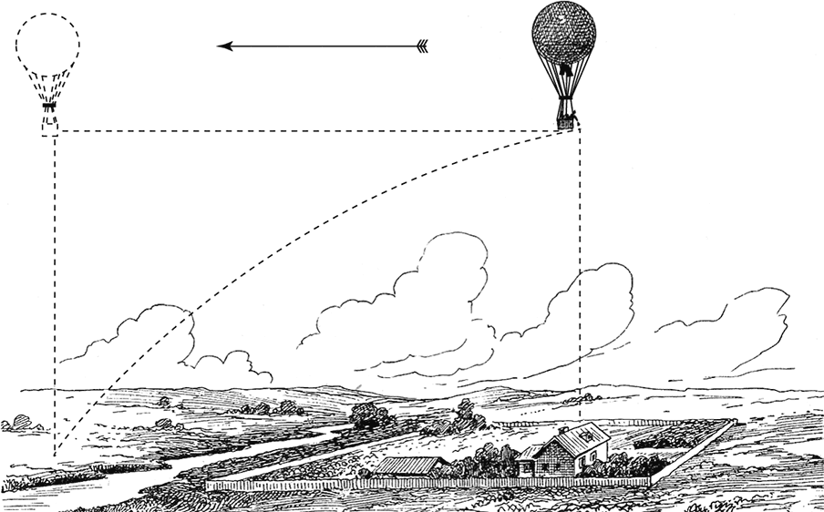 Рис. 3. Если уронить с летящего аэростата камень, то он падает не отвесно вниз, а по кривой линии, все время оставаясь под воздушным шаром.