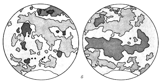 Рис. 8. Венера: а – в фазе серпа; б – приближенная карта ее полушарий