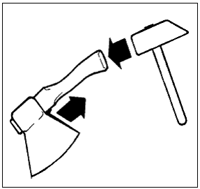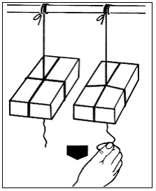 Всем нам знакомы «фокусы», связанные с инерцией. Если резко выдернуть скатерть, то находящиеся на ней предметы не падают. Молоток плотнее насаживается на рукоять, если другим молотком побить по рукояти первого сзади (рис. 20). Особенно впечатляет опыт, где тяжелый предмет – груз – подвешен на нити, а с него свисает еще одна нить, и по желанию можно порвать любую из них – либо ту, на которой предмет подвешен, либо свисающую. Если резко дернуть за свисающую нить, то инерция груза не даст ему разогнаться и порвется именно свисающая нить. Если же тянуть медленно, то к силе тяжести груза прибавится сила, с которой мы тянем вниз, и рвется верхняя нить: инерция в этом случае «помогает» очень мало из-за «статичности» натяжения нитей, когда скорость груза меняется очень медленно (рис. 21).