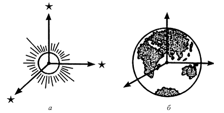 Таким образом, инерциальная система отсчета – это всего лишь научная абстракция. Реальная система отсчета всегда связывается с каким-либо конкретным телом – Землей, корпусом корабля, самолета или автомобиля, которое не неподвижно. Если мы захотим иметь очень точную (абсолютная – недостижима!) инерциальную систему отсчета, то должны будем поместить ее центр в центр Солнца – точнее, в центр массы Солнечной системы, а оси направить на три неподвижные (условно) звезды (рис. 22, а). Для большинства из технических задач центр инерциальной системы можно перенести из центра Солнца в центр Земли, а оси направить на те же звезды. В очень грубых случаях систему можно жестко связать с Землей, как известно, далеко не неподвижной (рис. 22, б).