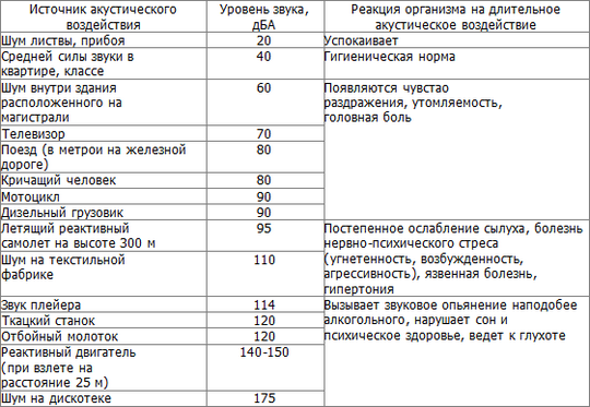 Воздействие шума на человека определяется его уровнем (громкостью, интенсивностью) и высотой составляющих его звуков, а также продолжительностью воздействия. Уровни шумов от различных источников и реакция организма на акустические приведены в следующей таблице.
