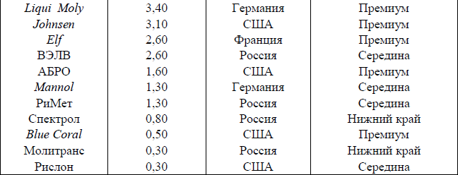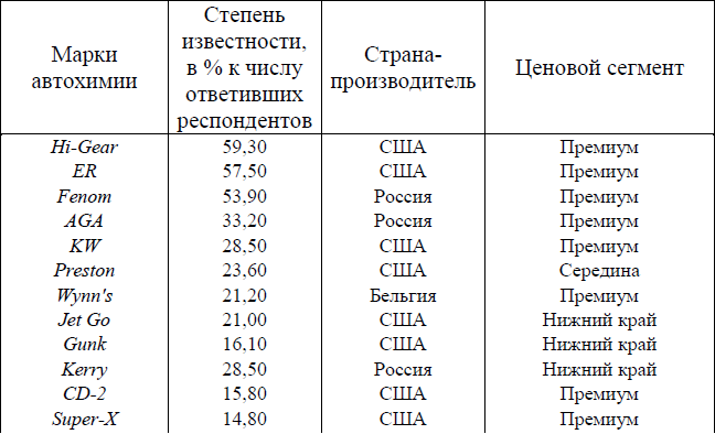 Согласно полученным данным, наибольшей известностью на рынке пользуется продукция американских фирм – производителей, а именно: Hi?Gear, ER, KW, Preston и некоторые другие. Безусловное доминирование американской продукции на российском рынке легко объясняется развитостью этого рынка в самих Соединенных Штатах, накопленным в этой связи огромным опытом американских производителей и искушенностью маркетологов. Из российских препаратов, благодаря применению международных приемов при их выводе на российский рынок, немалым успехом пользуются торговые марки Fenom и AGA.
