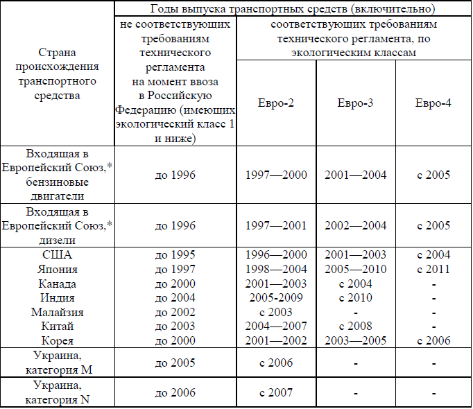 Таблица 4. Примерное соответствие автомобилей экологическим классам выбросов, в зависимости от их года выпуска и страны происхождения