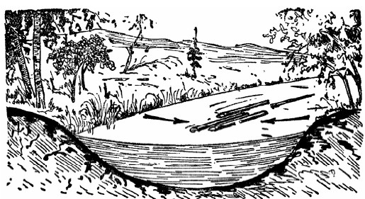 Почему в половодье поверхность реки слегка выпуклая, а в межень (т. е. при низком стоянии воды) – вогнутая (рис. 34 и 35)?