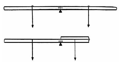 Читатель, подозревающий в вопросе подвох и готовый ответить, что стержень после сгибания останется в равновесии, заблуждается. С первого взгляда может, пожалуй, показаться, что обе половины прута, как имеющие одинаковый вес, должны уравновешиваться. Но разве одинаковые грузы на рычаге всегда уравновешивают друг друга? Для равновесия грузов на рычаге необходимо, чтобы отношение их величин было обратно отношению плеч. Пока стержень не был согнут, плечи рычага были равны, так как вес каждой половины приложен был в ее середине (рис. 67); тогда их равные веса уравновешивались. Но после сгибания правой половины стержня правое плечо рычага стало вдвое короче левого. И именно потому, что веса половин стержня равны, они теперь не уравновешивают друг друга: перетягивает левая часть, так как вес ее приложен в точке, удаленной от точки опоры вдвое более, чем в правой части (рис. 67, внизу). Итак, несогнутая часть стержня перетянет согнутую.