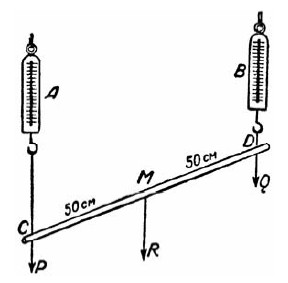 Оба безмена покажут одинаковую нагрузку. В этом легко убедиться, разложив (рис. 68) вес R гири на две силы Р и Q, приложенные в точках С и D. Так как МС = MD, то Р = Q. Наклонное положение стержня не нарушает равенства этих сил.