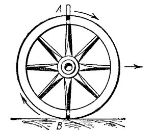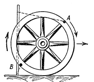 Выходит как будто, что верхняя часть колеса движется быстрее, чем нижняя. То же наблюдение можно сделать, если сравнить между собой верхние и нижние спицы катящегося колеса какого-нибудь экипажа. Будет заметно, что верхние спицы сливаются в одно сплошное целое, нижние же видимы раздельно. Дело опять-таки происходит так, словно верхняя часть колеса быстрее движется, чем нижняя.