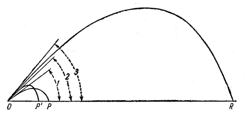Рис. 15. Как изменяется дальность полета снаряда с изменением угла наклона сверхдальнобойного орудия, при угле 1 снаряд падает в Р, при угле 2 – в Р; при угле же 3 дальность стрельбы сразу возрастает во много раз, так как снаряд залетает в слои разреженной атмосферы