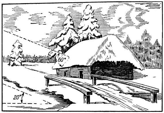 Рис. 51. Лучи Солнца греют наклонную крышу сильнее, чем горизонтальную земную поверхность (числа указывают величину углов)