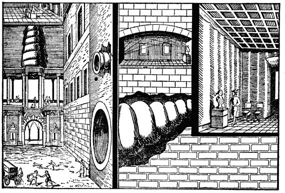 Строители средневековых замков нередко создавали такие звуковые курьезы, помещая бюсты либо в фокусе вогнутого звукового зеркала, либо у конца говорной трубы, искусно скрытой в стене. На рис. 81, заимствованном из старинной книги XVI века, можно видеть эти хитроумные приспособления: потолок в форме свода направляет к губам бюста звуки, приносимые извне говорной трубой; огромные говорные трубы, замурованные в здании, приносят разнообразные звуки со двора к каменным бюстам, размещенным у стен одной из зал, и т. п. Посетителю такой галереи казалось, что мраморные бюсты шепчут, напевают и т. п.