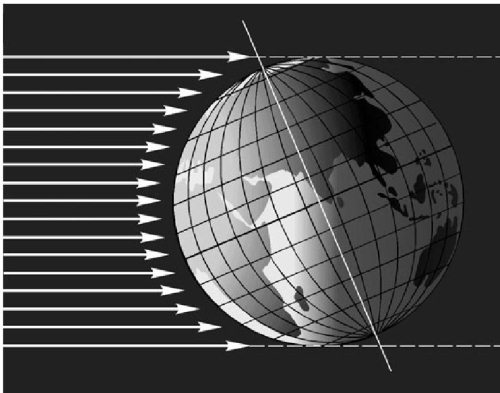 Рис. 1.2. Наклон оси вращения Земли к плоскости ее орбиты служит причиной смены времен года.