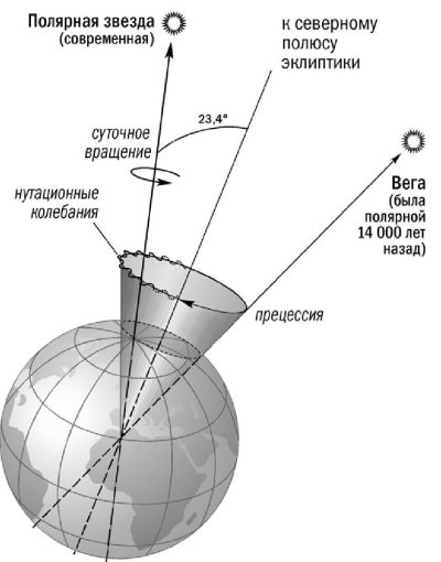 Движение Земли можно уподобить вращению волчка на полу: он быстро крутится вокруг оси и медленно покачивается на острие, описывая осью конус. Это покачивание вызвано притяжением волчка к Земле. Сама Земля – тоже своеобразный волчок: она испытывает притяжение со стороны Луны и Солнца. Под их гравитационным влиянием земная ось совершает медленное конусообразное движение. Один полный оборот по конусу с раствором в 23,4° ось Земли завершает за 25 770 лет. Соответствующее колебание совершает плоскость земного экватора и ее продолжение – небесный экватор. Эклиптика же, как отражение плоскости земной орбиты, остается практически неподвижной, поэтому точки ее пересечения с экватором на небе – точки весеннего и осеннего равноденствий – перемещаются по эклиптике вместе с движущимся экватором с востока на запад, навстречу годичному движению Солнца. Это явление называют прецессией (лат. praecessio предшествование), т. е. предварением равноденствия. Происходит оно не совсем равномерно: на него накладываются небольшие колебания – нутация, вызванная тем, что с периодом 18,6 года «покачивается» орбита Луны, а Луна – главный виновник прецессии земной оси.