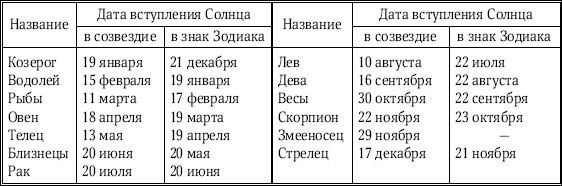 Два тысячелетия назад, когда были написаны классические руководства, до сих пор используемые астрологами, зодиакальные знаки располагались в одноименных им созвездиях Зодиака. Но перемещение точек равноденствия привело к тому, что зодиакальные знаки теперь расположены в других созвездиях. Солнце теперь попадает в определенный знак Зодиака на 2–5 недель раньше, чем доберется до одноименного этому знаку созвездия. Кстати, в соответствии с современными границами созвездий эклиптика пересекает теперь не 12, а 13 созвездий: к «классической дюжине» добавился Змееносец.
