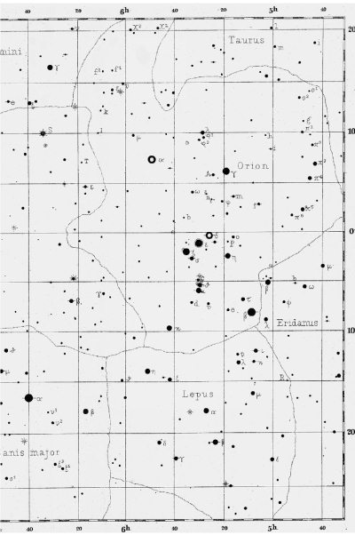 Рис. 1.8. Часть карты неба с областью созвездия Орион из «Звездного атласа для небесных наблюдений» Якова Мессера (СПб.: Изд. К. Л. Риккера, 1901). Нанесены звезды до 6m. Эпоха (сетка координат) 1880 г.