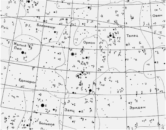 Рис. 1.9. Часть карты неба с областью созвездия Орион из «Звездного атласа» А. А. Михайлова, изданного Московским обществом любителей астрономии в 1920 г. Нанесены звезды до 5,75m. Эпоха 1920 г.