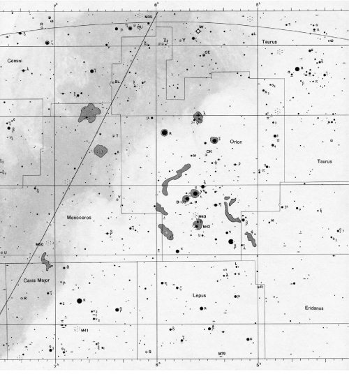Рис. 1.10. Часть карты неба с областью созвездия Орион из «Атласа звездного неба», созданного сотрудниками ГАИШ МГУ под редакцией А. П. Гуляева (М.: Космосинформ, 1998). Отмечены звезды до 6,5m. Эпоха 2000 г.