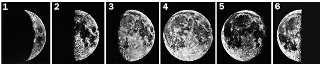Рис. 1.5. Фотографии Луны в различных фазах: 1 – молодая Луна (лунный серп, полумесяц), своей выпуклой стороной он всегда обращен в сторону Солнца; 2 – первая четверть; 3 – растущая Луна; 4 – полнолуние; 5 – убывающая Луна; 6 – последняя четверть.
