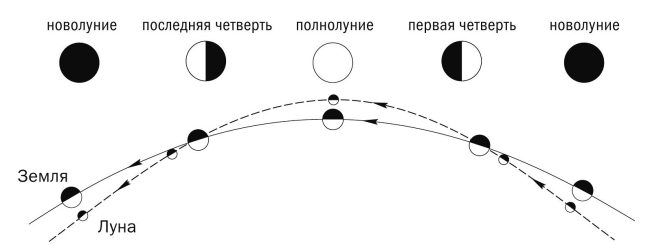 Рис. 1.6. Последовательные положения Земли и Луны на своих орбитах и соответствующие им фазы Луны с точки зрения земного наблюдателя.