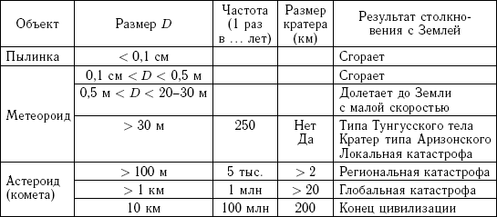 Как видно из табл. 1.1, результаты столкновения небесного тела с Землей разнообразны и могут иметь самые печальные последствия для жизни и деятельности людей. Более подробно последствия падения крупных тел на Землю рассмотрены в главе 8, а частота и энергии столкновений малых тел с Землей и оценки рисков – в главе 9.