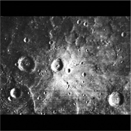 2.5.3. Кратеры на Меркурии. Начиная с 1973 г. с пролетной траектории космического аппарата «Маринер-10» была сфотографирована почти вся поверхность Меркурия с разрешением до 100 метров. Это позволило увидеть Меркурий примерно так же, как Луну в большой телескоп с Земли (рис. 2.11). Обилие кратеров – наиболее очевидная черта его поверхности, которую по первому впечатлению даже специалисты-селенологи приняли за поверхность Луны. Действительно, морфология кратеров близка к лунной, их ударное происхождение не вызывает сомнения. Но в целом меркурианские кратеры по сравнению с лунными менее глубокие, что, очевидно, объясняется различием ускорения силы тяжести.