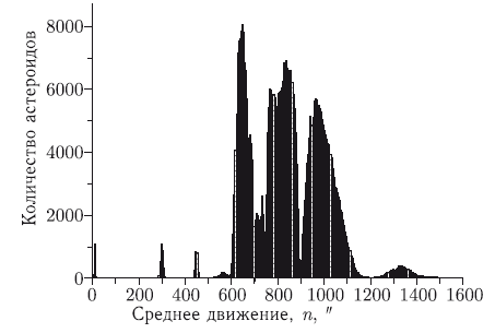 Главный пояс астероидов – образование, имеющее сложную динамическую структуру. Эта структура в основном определяется силами, действующими на малые тела в этой области со стороны Солнца и больших планет. Особое влияние на поведение тел в поясе оказывают разного рода резонансы, в частности резонанс между средним движением астероида n и Юпитера n?. О наличии резонанса можно говорить, когда отношение n: n? близко по величине к отношению небольших целых чисел – 2:1, 3:1, 4:1, 5:2, 7:3, или, другими словами, если средние движения астероида и Юпитера близки к соизмеримости низкого порядка. Соизмеримость обеспечивает повторяемость определенных конфигураций в положениях астероида и Юпитера на их орбитах через определенные небольшие промежутки времени. Интересно отметить, что в распределении астероидов по средним движениям (и в распределении астероидов по большим полуосям орбит, так как последнее является отражением первого) в области между 600–1200? соизмеримостям низких порядков соответствуют люки – более или менее широкие интервалы среднего движения, где астероиды совсем отсутствуют или плотность их распределения заметным образом понижена. На рис. 3.9 показано распределение астероидов по среднему движению (соответствующее ему распределение астероидов по большой полуоси и положение групп и семейств астероидов приведено в приложении 5).