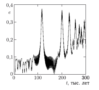 Рис. 3.10. Пример изменения эксцентриситета астероида в окрестности соизмеримости 3:1 с Юпитером с течением времени [Wisdom, 1983]
