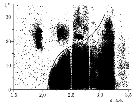 Вековые резонансы возникают при совпадении или почти совпадении средних движений перигелиев и/или узлов орбиты малого тела и орбиты возмущающего тела. Вековые резонансы приводят к сильным возмущениям эксцентриситета и/или наклона орбиты малого тела с очень долгими периодами, которые могут достигать десятков и сотен тысяч лет. Результат влияния вековых резонансов на элементы орбит астероидов можно наблюдать при сопоставлении элементов орбит большого числа тел. Вековые резонансы ограничивают область фазового пространства, в котором располагаются элементы орбит малых планет, а в ряде случаев рассекают ее на части. Вековые резонансы также причастны к переносу вещества из пояса астероидов в область внутренних планет [Knezevic and Milani, 1994]. В частности, у внутреннего края Главного пояса астероидов в окрестности значений большой полуоси a = 2,1 а.е. доминирует вековой резонанс ?6 (совпадение средних движений перигелиев орбит астероида и Сатурна; к нему имеют отношение также вековые осцилляции эксцентриситета орбиты Юпитера). Его расположение в поясе слабо зависит от эксцентриситета, но сильно зависит от наклона орбит: при наклонах, меньших 10°, он проходит в окрестности 2,1 а.е. При бо?льших значениях наклона область его действия смещается в сторону увеличения больших полуосей (рис. 3.11).