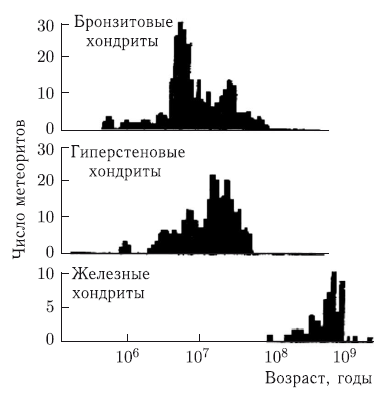 Начать можно с того, что, согласно современным численным экспериментам [Gladman et al., 1997], вещество, вброшенное в область действия наиболее мощных резонансов, очень быстро достигает района планет земной группы, где оно также не может существовать длительное время. В результате средняя продолжительность пребывания вещества в открытом космическом пространстве, вне тел, из недр которых оно было выброшено, до его попадания на Землю должна составлять всего лишь около десяти миллионов лет. Но эта оценка находится в явном противоречии с космическими возрастами метеоритов, надежно определяемыми по относительному содержанию изотопов, образующихся в их телах под воздействием космических лучей. Для каменных метеоритов эти возрасты лежат преимущественно в диапазоне 1–100 млн лет с максимумами распределения в области 20 и 50 млн лет для разных групп метеоритов, а для железных они составляют несколько сотен миллионов лет с максимумом около 800–900 млн лет (рис. 3.12).