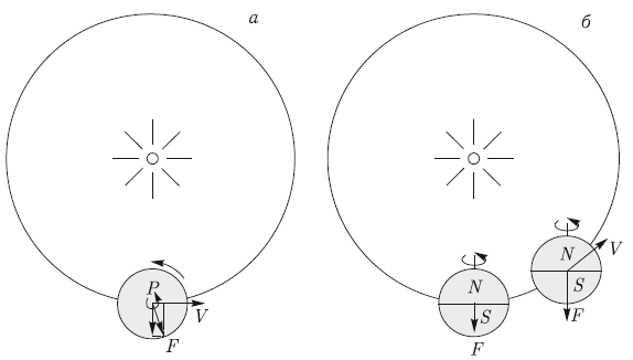 Различают суточную и сезонную составляющие эффекта [Bottke et al., 2002a]. Cуточная составляющая зависит от вращения тела вокруг оси, не лежащей в плоскости его орбиты. При этом из-за тепловой инерции вещества вечерняя половина тела оказывается более нагретой лучами Солнца по сравнению с утренней. Наиболее высокая температура поверхности достигается не в точках, где Солнце находится в меридиане (т. е. не в полдень), а в точках, чей местный меридиан повернут относительно меридиана подсолнечной точки на некоторый угол к востоку или западу в зависимости от направления вращения тела. Нагретое тело излучает тепло. Тепловые фотоны, покидая тело, сообщают ему некоторый импульс. Если бы температура поверхности сферически симметричного тела была всюду одинаковой, то усредненный результирующий импульс был бы равен нулю. Из-за различия температур в различных точках результирующий импульс отличен от нуля, причем из-за вращения тела он направлен не в сторону, противоположную Солнцу, а под некоторым углом к этому направлению (рис. 3.13 а). Его действие аналогично реактивному эффекту истечения газов из ядра кометы при нагревании его солнечными лучами. В зависимости от направления вращения ядра по отношению к направлению орбитального движения эффект Ярковского, подобно негравитационному эффекту в движении кометы, может вызывать как ускорение орбитального движения тела (сокращение большой полуоси), так и замедление движения (увеличение большой полуоси).