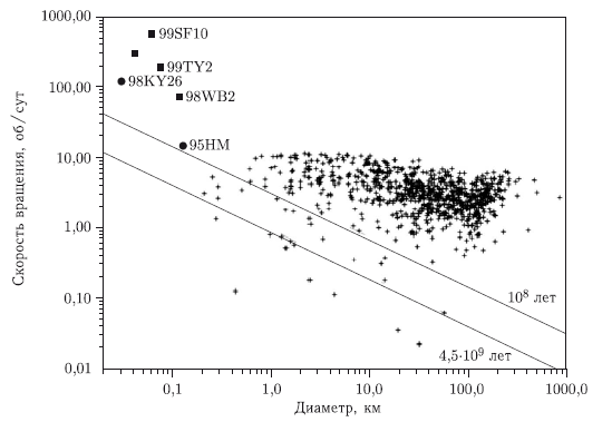Справа от линий критических скоростей на рисунке располагаются только два астероида. С учетом данных [Pravec et al., 2000] их пять. Размеры всех пяти астероидов лежат в пределах от 30 до 130 м, а периоды обращения – в пределах от 2,5 мин до 97,2 мин. Такие скорости вращения означают, что эти тела представляют собой монолитные образования, которые сохраняют целостность при быстром вращении за счет сцепления между частицами вещества.