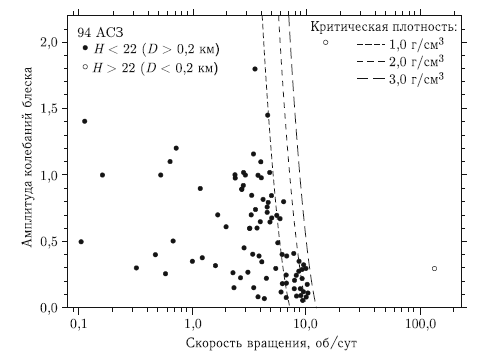 На рис. 3.22 приведено распределение скоростей вращения АСЗ в зависимости от полной вариации блеска за период. Штриховые линии представляют критические значения скорости вращения при различных значениях плотности, отмеченных на рисунке. Как видно из рисунка, все астероиды с диаметрами больше 200 м имеют скорости вращения, качественно согласующиеся с формулой (3.10). Концентрация точек к линиям, соответствующим критическим скоростям вращения при различных плотностях, является свидетельством того, что тела, большие по размеру, чем несколько сотен метров, являются гравитационно связанными агрегатами, состоящими из отдельных фрагментов («rubble piles», буквально переводится как «груда булыжников»).