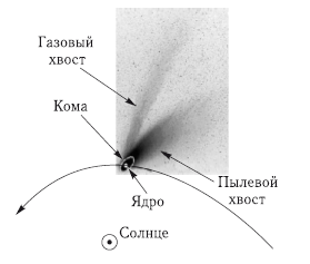 Выделяют следующие структурные составляющие кометы при ее движении вокруг Солнца: ядро, кому – газопылевую оболочку, окружающую ядро, газовый хвост, направленный в противоположную от Солнца сторону, и пылевой хвост, как правило, отклоняющийся от направления Солнце – кометное ядро. Строение обычной кометы показано на рис. 4.1.