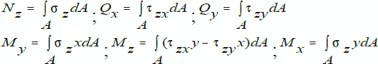 Просуммировав бесконечно малые силы и моменты, действующие в сечении, получим выражения, связывающие внутренние силовые факторы с напряжениями.