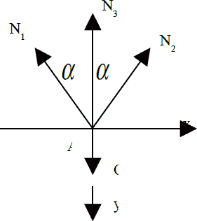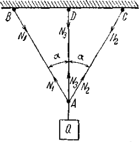 Пусть крайние стержни, имеющие равные площади поперечных сечений (F1 = F2) – стальные, средний стержень площадью F3 – медный. Длина среднего стержня – ?3, крайних – ?1 = ?2; допускаемые напряжения для стали – [?c], для меди – [?м]. Определить размеры поперечных сечений стержней под действием подвешенного груза Q. Установим силы, действующие на каждый из трех стержней. Считаем их растягивающими. Для их определения рассмотрим равновесие точки А. Схема действия сил на рисунке 2.2.