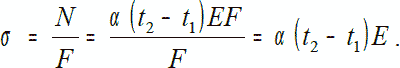 Напряжение, вызванное изменением температуры в стержне постоянного сечения с жестко защемленными концами, зависит лишь от материала, коэффициента линейного расширения, разности температур и не зависит от его длины и площади поперечного сечения.