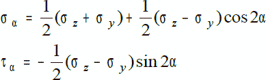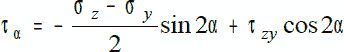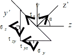 На Рис. 5.2 изображены напряжения на поверхности полученной призмы. Из условий равновесия треугольной призмы через проекции сил, действующих на грани, на оси y’ и z’, можно найти напряжения на наклонной грани призмы.