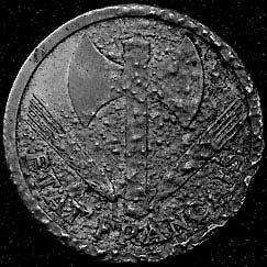 Монеты из алюминия: справа – не бывшая в обращении (Куба, 5 сентаво, 1971), слева – подвергшаяся коррозии (Франция, 2 франка, 1943)