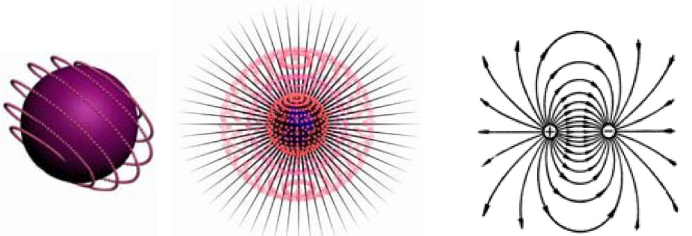 Такие свойства фотонов, как спин, степень и форма поляризации, самодвижение, вихревые токи в сплошных средах, размер области излучения и поглощение атомным электроном фотона, электромагнитная индукция и э.д.с. самоиндукции, а также анализ круговой равновесной мгновенной орбиты, на которой происходит удержание ускоряемых электронов в бетатроне, позволяют сделать заключение о том, что всегда изменяющееся за конечный временной период (импульс напряжения или обрыв тока) электрическое поле в точках, расположенных в зоне индукции стационарного источника, производит сферообразный и многооболочечный квант-сферу вихревого потока[54] магнитных потенциалов – магнитный монополь (фиг. 2.1), т. е. магнитный заряд со своим внешним магнитным полем, носитель кванта индуктированной энергии, источник самодвижения.