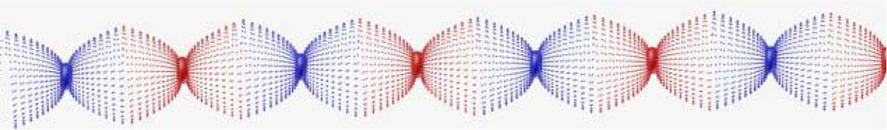 Механизм рождение микровихрона происходит следующим образом. Для наглядности рассмотрим совмещённое объёмное поле потенциалов двух равных и противоположных точечных зарядов (фиг.2.1, справа) атома водорода – протона и электрона, т. е стационарных источников[57]. Оно графически состоит из ассиметрически[58] совмещённых сферических эквипотенциальных поверхностей с противоположными потенциалами, между которыми на равном расстоянии от этих зарядов проходит плоскость[59] с потенциалом равным нулю. Силовые линии[60] напряженности поля исходят из положительного заряда и входят в отрицательный. В момент перехода электрона из возбуждённого состояния в основное уменьшается расстояние до ядра, путём движения к нему электрона – происходит процесс изменения электрического поля в пространстве между сближающимися зарядами. Наибольшие магнитные потенциалы, образующие поверхности сфер ближайшие к центру, рождаются в самый последний момент, соответствующий кратчайшему расстоянию между зарядами. В этих точках зоны индукции и рождается сферообразный объёмный магнитный монополь микровихрона путём центрального и синфазного слияния[61] микромонополей, образовавшихся на каждом изменяющемся[62] зерне-потенциале объёма этой зоны поля. Процесс синфазного слияния-зарядки[63] в локализованном объёме атома длится весь конечный период перехода из возбуждённого состояния в основное. За это время происходит рождение магнитного заряда, т. е. рост заряда до некоторой конечной величины – прямой процесс. Поглощение аналогичного магнитного монополя через посредство взаимодействия электромонополя вихрона с полем атома в такой же точке невозбужденного атома переводит его в состояние возбуждения – обратный процесс. По завершению этого периода названный квант-сфера, квант последовательно-вихревого потока потенциалов магнитного поля начинает процесс разрядки – своё каноническое поступательно-вращательное самодвижение. Синфазно с этим процессом магнитный монополь начинает рождать волновод из электропотенциалов, т. е. вихревой последовательный поток электропотенциалов-зёрен, которые он устанавливает стационарно в пространстве в строго геометрическом порядке (фиг.2.2), и противодействующий его разрядке переменный электрический монополь — это и есть активный фазовый объём (1/4 длины волны) первичного атомного микровихрона.