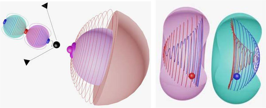 Фотоатомные реакции. Свойства различных микровихронов образовывать те или иные микрочастицы, прежде всего, зависят от промежутка времени и скорости изменения[94] полей, породивших их, а уж потом от условий полей пространства, через которые они проходят. Внешние свойства вихронов также зависят от длины волны, как свойства радиоволн отличаются от свойств фотонов, рентгеновских лучей и гамма-квантов. Так, например, при энергии налетающего на атом фотона гамма-излучения выше пороговой в 1022 Кэв электромонополь его свободного микровихрона тормозит до полной остановки движение магнитного монополя, взаимодействуя с полем атомного ядра. При этом происходит его деление на два самостоятельных, но замкнутых[95] и покоящихся вихрона, в фазовом объёме которых уже рождаются гравитационные монополи. На фиг.2.4 приведена схема деления свободного (чёрный шарик) вихрона таких фотонов на два разнополярных (красный и синий).