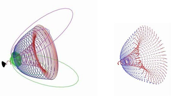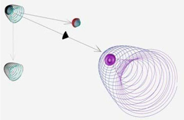 Разрядка гравитационного монополя – это вращательное движение по внутренней красной спирали, т. е. движение спирального зелёного тора. Во время этого движения происходит развёртка-установка[194] своих же зёрен-потенциалов массы на внутреннем волноводе от большего до меньшего, которые при достижении замкнутости поверхности электрона во внешнем пространстве, как от стационарного источника, индуктируют массу и электрический заряд электрона. Структура значений потенциалов сферы гравитационного монополя, аналогична магнитному – большей сфере спиральных волноводов из зёрен соответствуют меньшие значения по абсолютной величине, а меньшей – наибольшие значения потенциалов. Поэтому, когда гравитационный монополь разрядился, его наибольшая сфера в этот момент находится в точке волновода с максимальной пучностью, откуда начинал свою зарядку и движение вновь индуктированный магнитный монополь сферой большего радиуса, а в данный момент заканчивает свою зарядку сферой меньшего диаметра (положение, чёрный шарик на фиг. 2.9). Итак, разряжаясь из центральной точки расположения зелёной сферы, гравитационный монополь создаёт волновод из зёрен-потенциалов (масса), и заряжает магнитный монополь, который, как и в фотоне, создаёт волновод из зёрен-электропотенциалов. Волновод из зёрен-гравпотенциалов и создаёт постоянное внешнее гравитационное поле – массу покоя электрона.