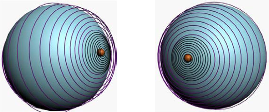 Внешнее проявление свойств формы волноводов электрона с вращающимся полярным магнитным монополем – это его спин, электрический заряд, геометрическая структура и индуктируемая масса[193] (в терминах системы СИ или СГС), а также бесконечно долгое время жизни. Внутренние свойства электрона, ответственные за это внешнее проявление, обусловлены процессами, происходящими в резонансном полярном вихроне, в котором магнитный монополь периодически и всегда движется-вкручивается (имплозия осевая) в одном направлении в сторону к центру поверхности полусферы, где исчезая, преобразуется в гравитационный монополь. Последний, разряжаясь (внутренняя спираль разрядки гравитационного монополя, показанная на фиг. 2.8) в поле волновода (внешняя спираль), опять реанимирует его – индуктирует и заряжает магнитный монополь и так до бесконечности. Другими словами, бесструктурной точечной пассивной массы электрон не имеет, а имеет внутренний волновод из гравпотенциалов, который, создавая внешнее гравитационное поле, взаимодействует с центральным гравитационным полем Земли, инертен и проявляет собственную массу. Точно также внешний волновод из электропотенциалов формирует отрицательный электрический заряд электрона.