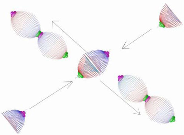 На фиг. 2.9 показана упрощённая схема процесса индукции поляризованного магнитного монополя (чёрный шарик) в замкнутом объёме электрона пространственной разрядкой гравитационного монополя (зелёные шарики на красном внутреннем волноводе). После того, как в поле атомного ядра, магнитный монополь фотона поделился пополам (чёрный конус), он до полной остановки во время торможения превратился-зарядился в свой аналог, источник движения в замкнутом объёме – гравитационный монополь (зелёный шарик в центре на поверхности волновода), как процесс противодействия изменению скорости. Поэтому его структура аналогична структуре магнитного монополя (фиг.2.1). Однако некоторые его свойства отличаются от свойств магнитного. В отличие от магнитного он производит волновод из зёрен-гравпотенциалов без посредства участия других полей, т. е. без противодействующего электрического вихревого поля, как это происходит с магнитным зарядом фотона. Имеются и другие существенные отличия. В свободном вихроне фотона зарядка магнитного монополя находится в функции противодействующего предыдущему электрического монополя. В замкнутом вихроне электрона эта функция возлагается на гравитационный монополь. Общее для обоих – зарядка магнитного монополя происходит без возбуждения вторичных полей.