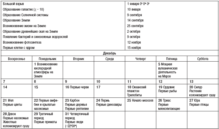 Легко видеть, что эта таблица в своей основной части сугубо «антропоцентрична»: даты и моменты космического календаря после «сентября» и особенно всего специально выделенного «декабря» отражают определенные этапы развития жизни на Земле. Этот календарь совершенно иначе выглядел бы для обитателей какой-нибудь планеты, обращающейся вокруг «своей» звезды в какой-нибудь удаленной галактике. Тем не менее само сопоставление темпа космической и земной эволюции в высшей степени впечатляюще.