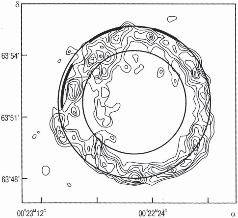 Рис. 9. Схема оптической, радио- и рентгеновской структуры остатка сверхновой 1572 г. Жирные сплошные линии – оптические волокна. Две концентрические окружности определяют оболочку, излучающую рентгеновские кванты