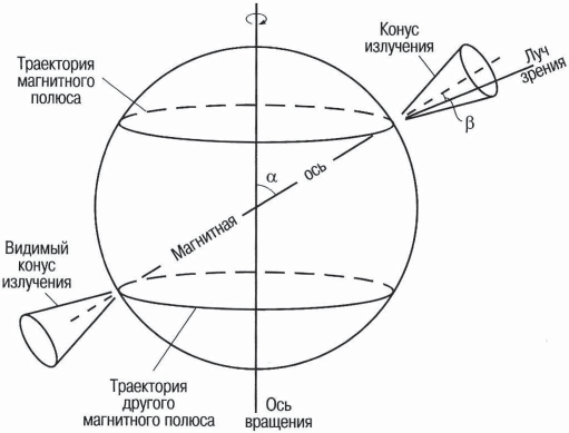 Не сразу было понято, что причиной строгой периодичности радиоимпульсов от этих новых источников (получивших название «пульсары») является быстрое вращение звездообразных объектов. Только вращение массивного тела может объяснить удивительное постоянство (с точностью до стомиллионной доли) периодов пульсаров. Более тщательные наблюдения показали, что на самом деле периоды не строго постоянны, а медленно растут. Представим себе, что излучение радиоволн не равномерно по всем направлениям, а сосредоточено внутри некоторого конуса, ось которого образует определенный угол с осью вращения. Теперь вообразим себе наблюдателя, который в какой-то момент времени находится на продолжении оси конуса. Ясно, что он сможет наблюдать радиоизлучение. Это будет возможно в течение некоторого времени до тех пор, пока из-за вращения звезды ось конуса уйдет достаточно далеко. Однако через промежуток времени, равный периоду вращения звезды, радиоизлучение снова можно будет наблюдать. Эта простая модель пульсара изображена на рис. 10.