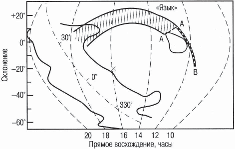 На рисунке отчетливо видна концентрация яркости к полосе Млечного Пути. В то же время видно, что левее галактического центра изофоты радиоизлучения круто поднимаются вверх. Это и есть описанный «язык».