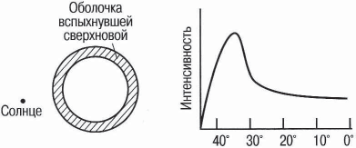 Рис. 13. Схема, поясняющая вспышку сверхновой звезды около солнца. Справа дано распределение радиояркости оболочки в зависимости от углового расстояния до ее центра