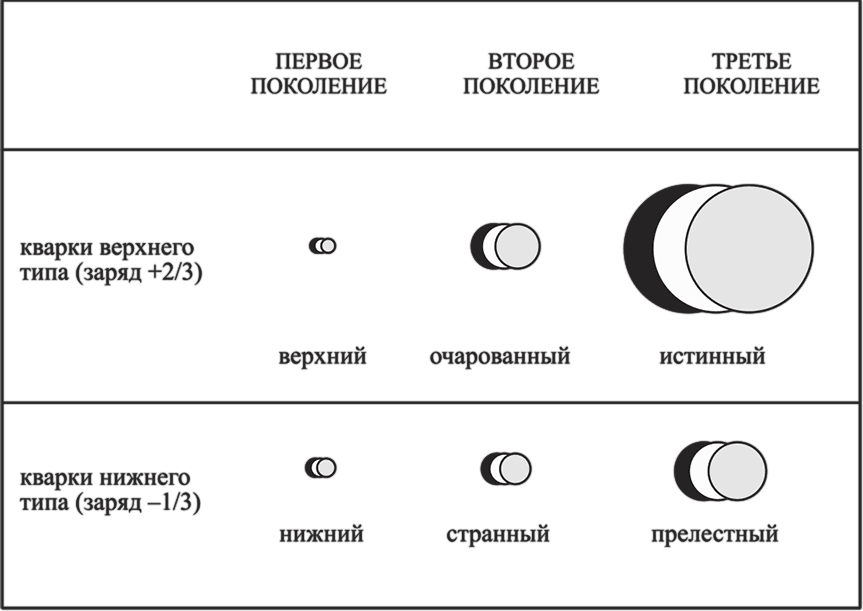 Загадка была разгадана в 1964 году Мюрреем Гелл-Манном и Джорджем Цвейгом, независимо друг от друга предположившими, что адроны состоят из более мелких частиц, названных кварками. Как и лептонов, кварков шесть типов, или, как принято говорить, шесть ароматов: верхний (up), нижний (down), очарованный (charm), странный (strange), истинный (top, truth) и прелестный (beauty, bottom). Верхние, очарованные и истинные кварки имеют электрический заряд +2/3, в то время как нижние, странные и прелестные кварки имеют заряд ?1/3. Иногда их разбивают на две группы: кварки «верхнего типа» и «нижнего типа» соответственно.